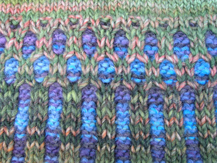 As I was designing on the fly (no swatches for me, so sirree Bob) I made the stitches travel after the corrugated ribbing was done and found myself creating a stained glass window type stitch that really worked well to showcase the colors of Geologee. Sometimes you take short cuts, and you get lucky.