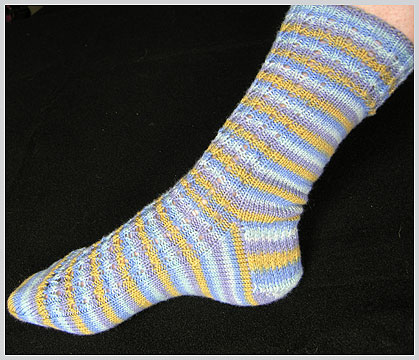 During my latest trip out of town (yes, again having to decide what projects to take), I took inspiration from a sock designer I very much admire, Cookie A. I find the way she makes the stitches move around in her sock designs intriguing and clever. So, as I looked at a new color of Ty-Dy Socks Dots (called Periwinkle, brand spanking new and not even in stock, yet), I decided to take a small stab at making my sock stitches travel, too. Still don't know what I'll call this design. Any suggestions?