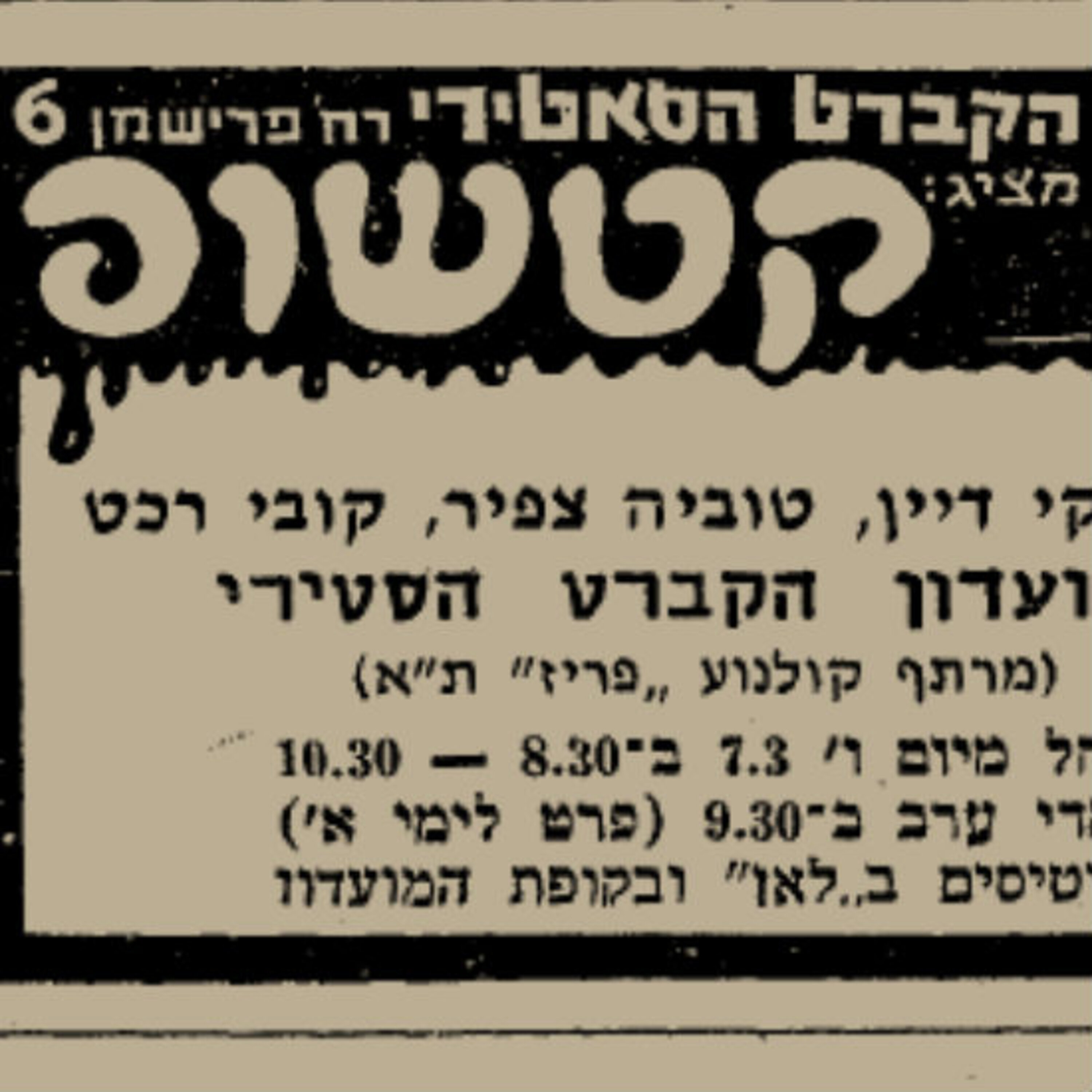 משתתפים: רוז'קה קורצ'אק-מרלא, משה קלכהיים, פאני לוץ, גבי אורן, עקיבא ניר, יעקב גרינשטיין ויעקב שיביטינסקי